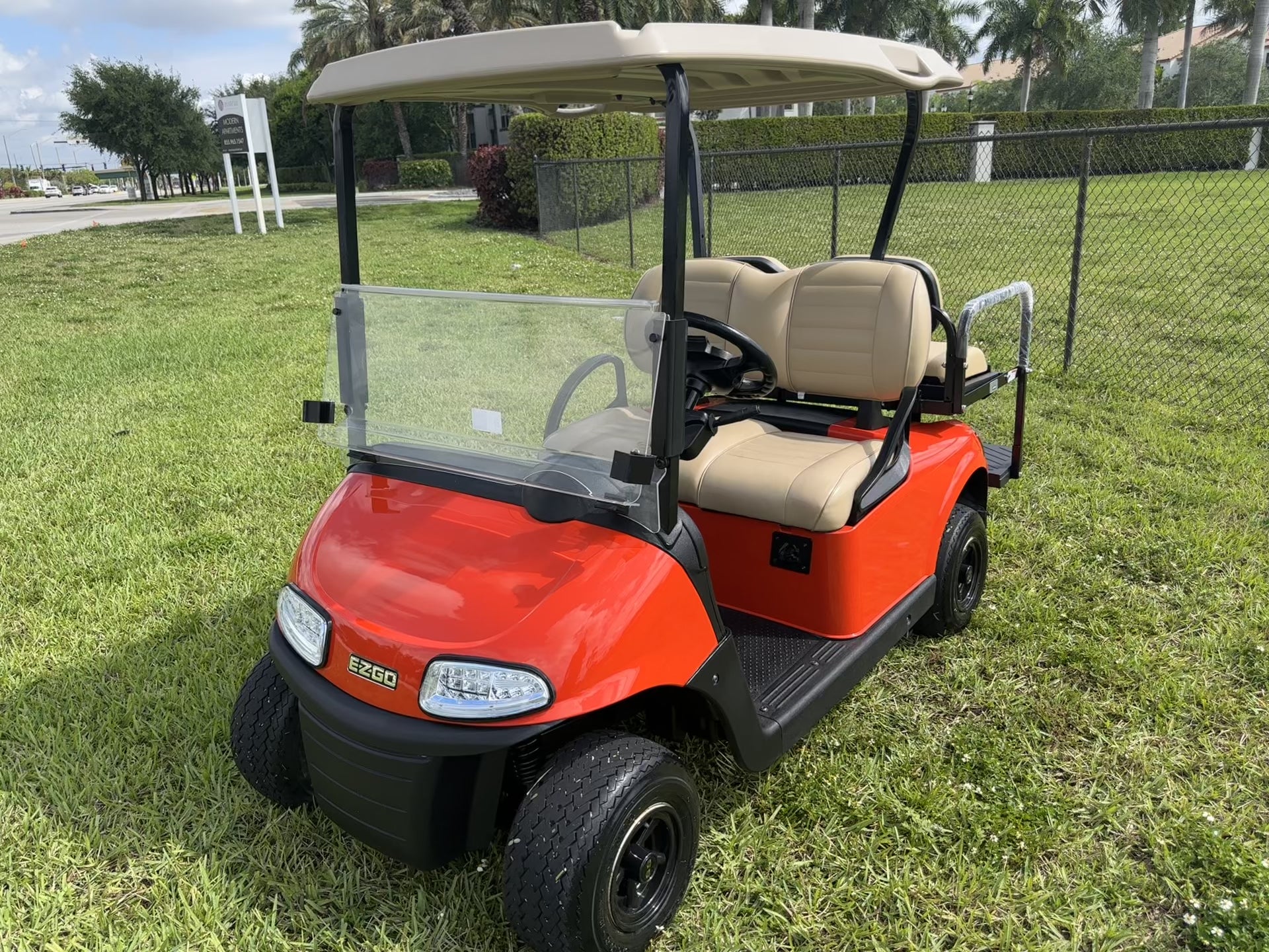 Go Mango Orange EZGO RXV: AC Driven, 48V Trojan Batteries, Custom Style, Black Wheel Covers, Back Seat, Deluxe Light Kit - Signals, Brake Light & Horn
